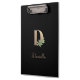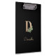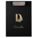 Elegant black clipboard features a gold botanical monogram in the centre.