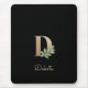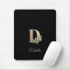 Elegant black mouse pad features a gold botanical monogram in the centre.