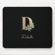 Elegant black mouse pad features a gold botanical monogram in the centre.