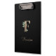 Elegant black clipboard features a gold botanical monogram in the centre.