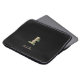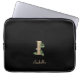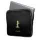 Elegant black laptop sleeve features a gold botanical monogram in the centre.