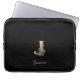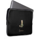Elegant black laptop sleeve features a gold botanical monogram in the centre.