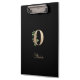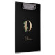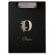 Elegant black clipboard features a gold botanical monogram in the centre.