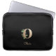 Elegant black laptop sleeve features a gold botanical monogram in the centre.