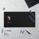Elegant black desk mat features a gold botanical monogram in the centre.