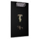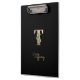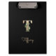 Elegant black clipboard features a gold botanical monogram in the centre.