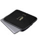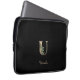 Elegant black laptop sleeve features a gold botanical monogram in the centre.