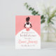 Bridal shower invitation with silhouette of an elegant bride against pastel pink background.