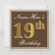 This simple and elegant birthday party invitation design features a personalised message like "Name-Here’s 19th Birthday" (with the "19th" having a faux/imitation gold-like colouring look) within a brown-coloured square area featuring a simple border outline. The name is in an elegant white-coloured script-like text, and can be customised. The back features personalised invitation details. A birthday party invitation like this could perhaps be used when inviting people to a birthday party being held for somebody who is celebrating their nineteenth birthday. [~Z0000229]