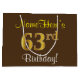 This simple, elegant birthday gift bag design features a personalised message like "NameHere’s 63rd Birthday!" (with the "63rd" having a faux/imitation gold-like colouring look) on a brown coloured background. The name is in script-like, yellow-coloured text, and can be personalised. A personalised birthday gift bag like this could perhaps be used when giving a present or gift to somebody who is celebrating their sixty third birthday. [~Z0000262]