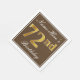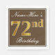 This simple and elegant paper napkin design features a message like "Name-Here’s 72nd Birthday" (with the "72nd" having a faux gold-like colouring) within a brown-coloured square area featuring a simple border outline. The name is in a white-coloured script-like text, and can be personalised. Napkins like these could perhaps be used at a birthday party for somebody who is celebrating their seventy second birthday. [~Z0000139]