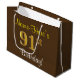 This simple, elegant birthday gift bag design features a personalised message like "Name-Here’s 91st Birthday!" (with the "91st" having a faux/imitation gold-like colouring look) on a brown coloured background. The name is in script-like, yellow-coloured text, and can be personalised. A personalised birthday gift bag like this could perhaps be used when giving a present or gift to somebody who is celebrating their ninety first birthday. [~Z0000262]
