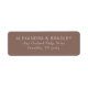 These return address labels feature a minimalist design with a centred layout on a solid brown background, creating an elegant and sophisticated look. The light cream text contrasts beautifully against the darker backdrop, utilising a clean, sans-serif font for clarity and modern appeal. Perfect for formal occasions like weddings or invitations, these labels offer customisable fields for names and addresses while maintaining a simple yet refined aesthetic. Their uncluttered composition ensures readability and adds a touch of class to any correspondence.