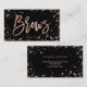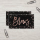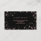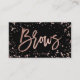 A modern, stylish lashes, eyes brows business card with modern hand lettering style brush typography in faux rose gold foil on a rose gold confetti splatters with customisable black background.