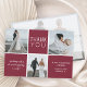 Modern simple minimalist wedding thank you card on a dark red burgundy background with a collage of three square photos on the front side and one full bleed on the back and with a trendy white typography script.++++++++ Upload your photos and personalise it with your details! ++++++++++++++++ Please note that the background wine red colour and the colour and font of the lettering are editable. You can change them after selecting CUSTOMIZE option.