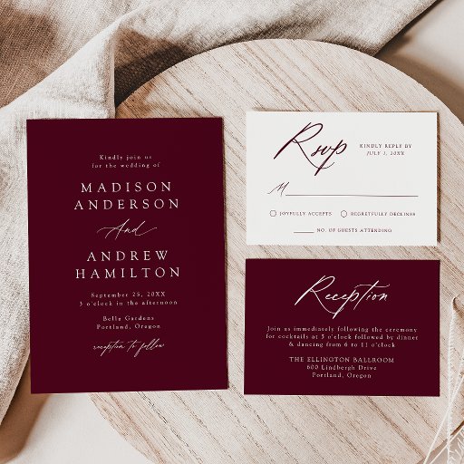Elegant Burgundy and Gold Foil Calligraphy Wedding All In One Invitation