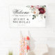 Elegant welcome wedding banner. Design featuring beautiful watercolor florals in shades of deep burgundy red, blush pink and cream with hues of succulent sage greenery and other botanical foliage. All wording and fonts are editable on this romantic design.