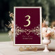 Add elegant coordination to your reception with this burgundy and gold wedding table number, adorned with romantic floral line art and a heart motif. Ideal for autumn or winter weddings, this stylish sign helps guests find their seats with charm.