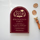 Formal arch-shaped burgundy red college graduation party invitation featuring "Class of" within a gold illustration of a laurel wreath incorporating a grad cap and diploma, and the graduate's name in an elegant light gold script. Add their school, major, honours or future plans and the graduation party details in gold lettering.