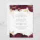 An elegant botanical design featuring burgundy floral borders at the top and bottom, trimmed with gold faux foil and glitter leaves, framing the classic charcoal grey text on a white background. A matching floral design appears on the back of the card.