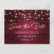 Custom burgundy rustic wood wedding save the date postcards with faux gold foil script font and featuring a rustic wood background adorned with string lights. Easily personalise this rustic save the date postcard with your wedding details. For custom requests, please send us a message.