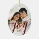 A simple, elegant photo ornament, featuring stylish text, reading "Joy" in a pretty script font. The back contains a snow design over a matching background colour. Great for a newlywed first Christmas or for anyone!