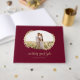 Complement your burgundy and gold wedding with this minimalist, yet elegant wedding photo guest book featuring a gold wreath photo frame on a plain burgundy background.