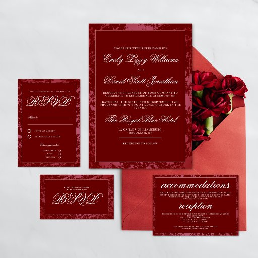 Classic traditional vintage elegant style crimson red and blush tone abstract art texture border with calligraphy script personalised wedding QR code budget response card. This product can be easily personalised. If you need help with the customisation of the product kindly please message me via Zazzle.