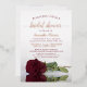 This beautiful bridal shower invitation features a gorgeous design with a single long-stemmed burgundy rose reflecting in a pool of water. The elegant script calligraphy lettering includes burgundy or maroon coloured text interspersed with real pressed foil rose gold accents. Elegant, classy, sophisticated and chic, these invitations are a wonderful way to celebrate the bride to be.