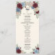 This layout employs a formal typographical hierarchy, utilizing a sweeping handwritten script for headers balanced by a highly legible, traditional serif font for course details. The text is framed by an asymmetrical, printed watercolor botanical arrangement featuring deep red and soft blush blossoms, intertwined with muted green foliage against a crisp cream background for optimal visual contrast. This is a flat printed image with a printed watercolor effect, not actual raised material.
