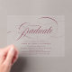 Celebrate your graduate in style with our simple and modern graduation party invitations! Featuring the word "Graduate" in elegant burgundy calligraphy, these unique invitations are designed with a sleek frosted or transparent acrylic background that adds a touch of sophistication to any celebration. Easily customise these acrylic graduation invitations with the graduate’s name, graduation year, school name, and all the important party details. Perfect for showcasing your high school or college graduate’s milestone, these stunning invitations will leave a lasting impression on your guests.