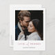 This simply chic photo wedding thank you postcard template features an elegant, minimalist, modern design. The front features your first names under your favourite photo and a 'LOVE and THANKS' message conveyed with a striking blend of two distinct fonts, with 'and' in a light, flowing script between the rest of the other two words, which are in upper case with a bold, crisp formal look.The 'LOVE and THANKS' part of the design is in an elegant shade of burgundy and can't be altered. But we also offer versions of this card separately with this text in black and also in gold, so please check those as well. When you edit the front to show your own names, you might change the colour of that text to gold or something other than the default black according to your taste. On both sides we've set the background as transparent, so that the colour of the paper will simply serve as the base colour. You can choose a colour for the background on one or both sides if you prefer. The default text colour on the back is dark grey, but you can change this if you prefer another colour. We've put some sample text on the back for you to replace with your own message as you see fit, but please don't feel restricted by this. If you prefer delete our sample text entirely and keep the back message part of the card totally blank so that you can write a handwritten note on each card instead, you can do that. Or you might want to replace our text with your own message of gratitude and your own closing and then hand sign your names when you receive the cards. In any case, please do remember to remove all of the sample/placeholder text including the return address and message on the back as well as the sample photo and details on the front! We've chosen matte rather than semi-gloss as the default paper choice, as it is well suited to writing your own message on and won't smudge. You can of course change this to semi-gloss if you prefer. Use the intuitive editing tools, your favourite photo and your inspiration to make this stylish modern wedding thank you postcard uniquely yours!