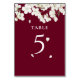 Elegant burgundy and pretty white blossom floral table number. Personalise with your table numbers in a modern stylish text. Designed by Thisisnotme©