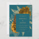 This elegant, moody wedding invitation features a lush, romantic floral bouquet in burnt orange and rust with gold faux foil and glitter foliage on a teal blue background. Customise the gold-coloured text in stylish fonts on a teal rectangle. The back of the card is solid teal.