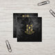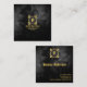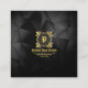 This trendy design is a gold monogram logo with gold business name slogan and contact details all on black abstract shapes background.