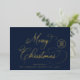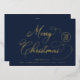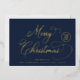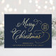 An elegant dark blue corporate holiday card that features your company logo (upload a black version for best results) "Merry Christmas" showcased in a stylish calligraphy script and your business name in classic serif typography, all rendered in your choice of genuine gold, silver or rose gold foil. On the back, upload a white or light coloured version of your logo, personalise your seasonal greeting and message of customer appreciation, and add your website or other information if desired.