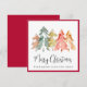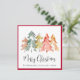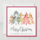 Elegant square red holiday card for your business featuring a modern watercolor abstract of pine trees, "Merry Christmas" in a stylish script and your company name in classic serif typography.