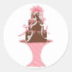 A pretty sticker to add to birthday packages, for kids parties, wedding showers, etc . A chocolate designer cake with pink trim. Pretty pink and white ribbons trailing down on a pretty pink cake stand!