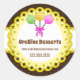 © 2021 Socialite Designs. Elegant cake pops bakery sticker design incorporating a chocolate brown damask pattern background, yellow scalloped border banner for your text, and a colourful cake pops design.