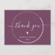 NewParkLane - Sophisticated personalised wedding postcard, with 'Thank You' in elegant script typography /calligraphy with swirls, a tiny white heart, and a dotted round frame, against a burgundy / plum background.