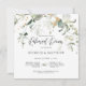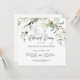 Design features Rehearsal Dinner wording in a modern calligraphy script surrounded by gold accented eucalyptus greenery. Easily customise with important information of choice on the front and monogram initials of choice on the back.