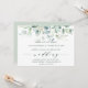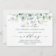 This wedding invitation features painted watercolor eucalyptus, botanical green, and light blue leaves with modern calligraphy.