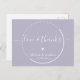 NewParkLane - Sophisticated personalised wedding postcard, with 'Love & thanks' quote in elegant script typography /calligraphy with swirls, a tiny white heart and a dotted round frame, against a lavender background.