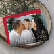 Celebrate the season with this Elegant Calligraphy Merry Christmas 2 Photo Holiday Card. The front showcases a full-bleed horizontal family photo with “Merry Christmas” in elegant calligraphy script, along with your family name and the year beneath. The back displays a second horizontal photo on a festive red background accented with a delicate white dotted snow pattern. A classic and joyful holiday card design.