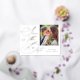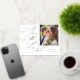 This elegant save the date postcard features delicate calligraphy and a unique design. The front of the postcard includes the phrase "Save the Date" written in beautiful gold foil script lettering. The couple's names, wedding date, and wedding location are creatively positioned within the typography design. The front of the save the date also includes a photo of the couple. On the back, there is room to add additional details about the wedding.