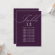 Purple wedding table seating card with elegant calligraphy and editable typography. Simple, modern minimalist design to suit your wedding colours. Table is lettered in handwritten script and the template is ready for you to edit the table number and your guest seating list.