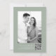 Announce your wedding with this modern and elegant save the date card, designed to captivate your guests with its timeless charm. "Save the Date" is displayed vertically on the left side in graceful white calligraphy against a soothing sage green background, creating a sophisticated and natural aesthetic. Your vertical engagement photo is beautifully positioned on the right, adding a personal and stylish touch to the design. Personalise the card with your names, wedding date, and location in bold white lettering for a polished and cohesive look. The back of the card includes space for an additional photo, along with your wedding website and a convenient QR code to effortlessly share event details. Perfect for couples seeking a simple yet refined announcement, this design sets the tone for a truly memorable celebration.