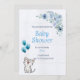 It's a cart for a Baby Shower invitations has a little cute cat with a three bleu balloons and a plant calyptus and a blue flowers