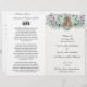 The image on front features a vintage image of the Blessed Virgin and St. Joseph exchanging their wedding vows inlaid in a gold frame with mint green and lavender flowers. A rosary is below. The back of the program has a beautiful prayer for the bride and groom. The three hearts above the prayer represent Jesus, Mary, & St. Joseph.