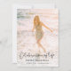 A modern, minimalist full photo funeral invitation to celebrate the life of your loved one in a minimalist clean simple design style featuring a elegant handwritten script font and a soft pastel peach background. The design template can easily be personalised with your own photo and text to create a special tribute for your loved one's funeral, memorial or celebration of life. The image shown is for illustration purposes only to be replaced with your own photo. The placeholder image shows a happy young woman with wavy long blonde hair wearing an elegant chic pastel floral summer dress standing in the sea at sunset on a sandy beach in the shallow breaking waves. #funeral #invitation